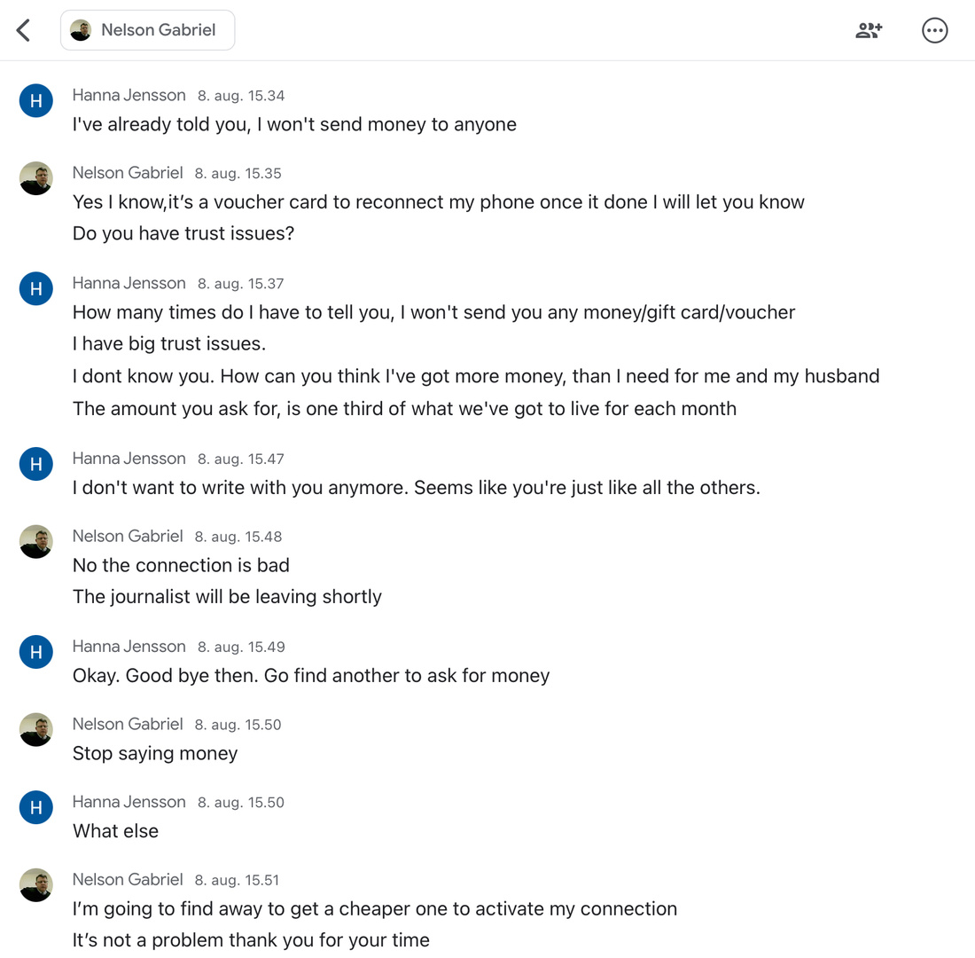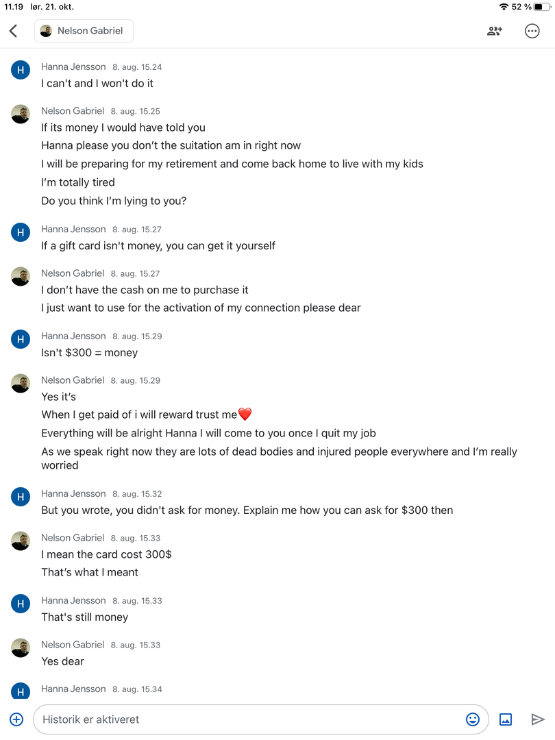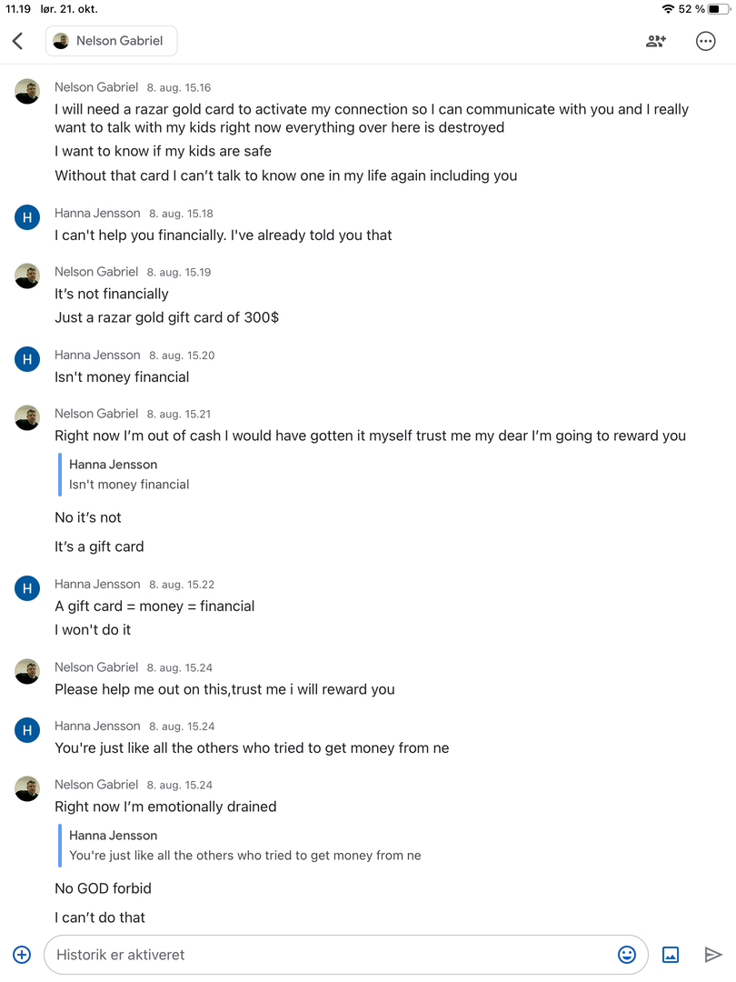 It didn’t take long before he needed help after a bombing. I wrote that I would not and could not help with money. He wrote it wasn’t money, only a razor gold gift card to activate his connection so he could communicate with me.