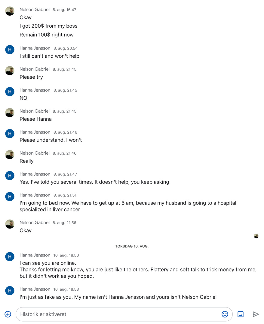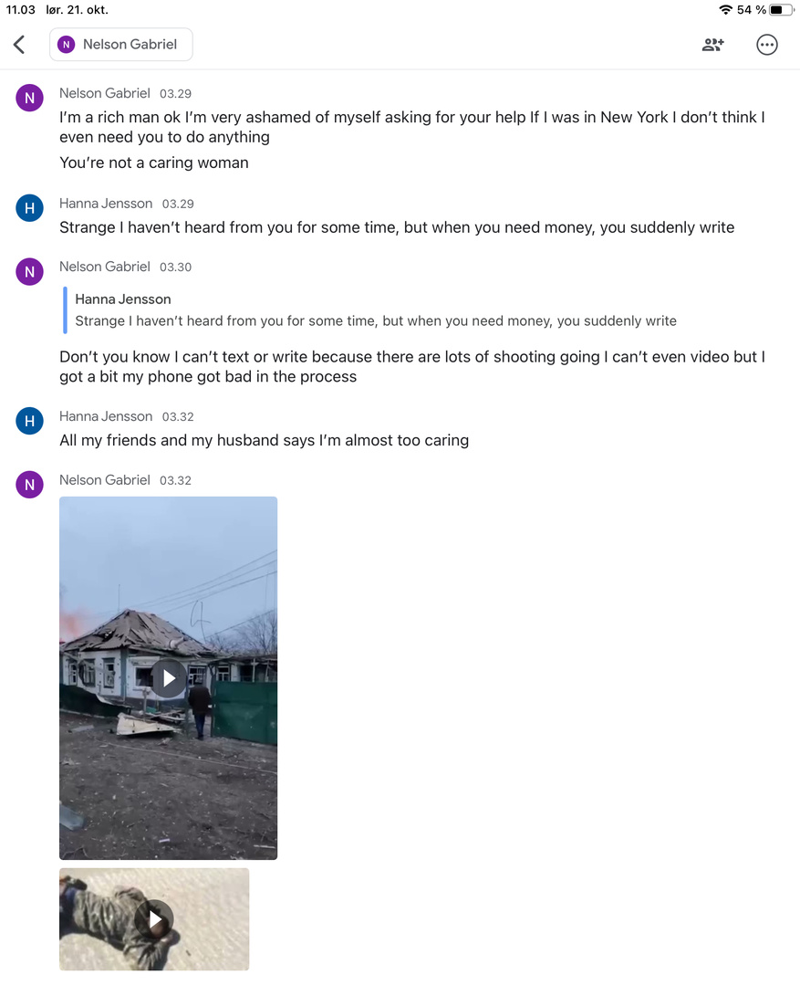 I started writing with this person on Scrabble Go. He asked if we could use Google chat. He claims to be a neuron surgeon working in a war zone.