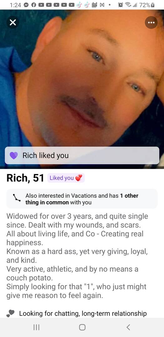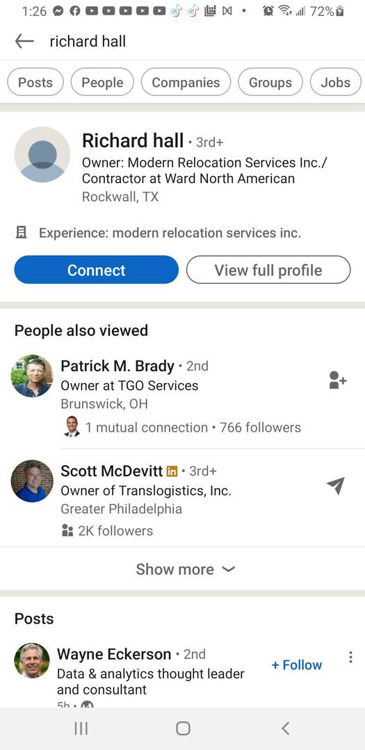 Original: Has LinkedIn profile under Rick Hall & Richard Hall under McKinney, TX & Rockwall Texas as the owner of Modern Relocation Services. The cell phone number he gave me on Facebook Dating is 9725035919. He is under Rich, 51 years old in McKinney, TX. When texting off site. He sent the word "Alaye", which is an African Yorba word for scammer.