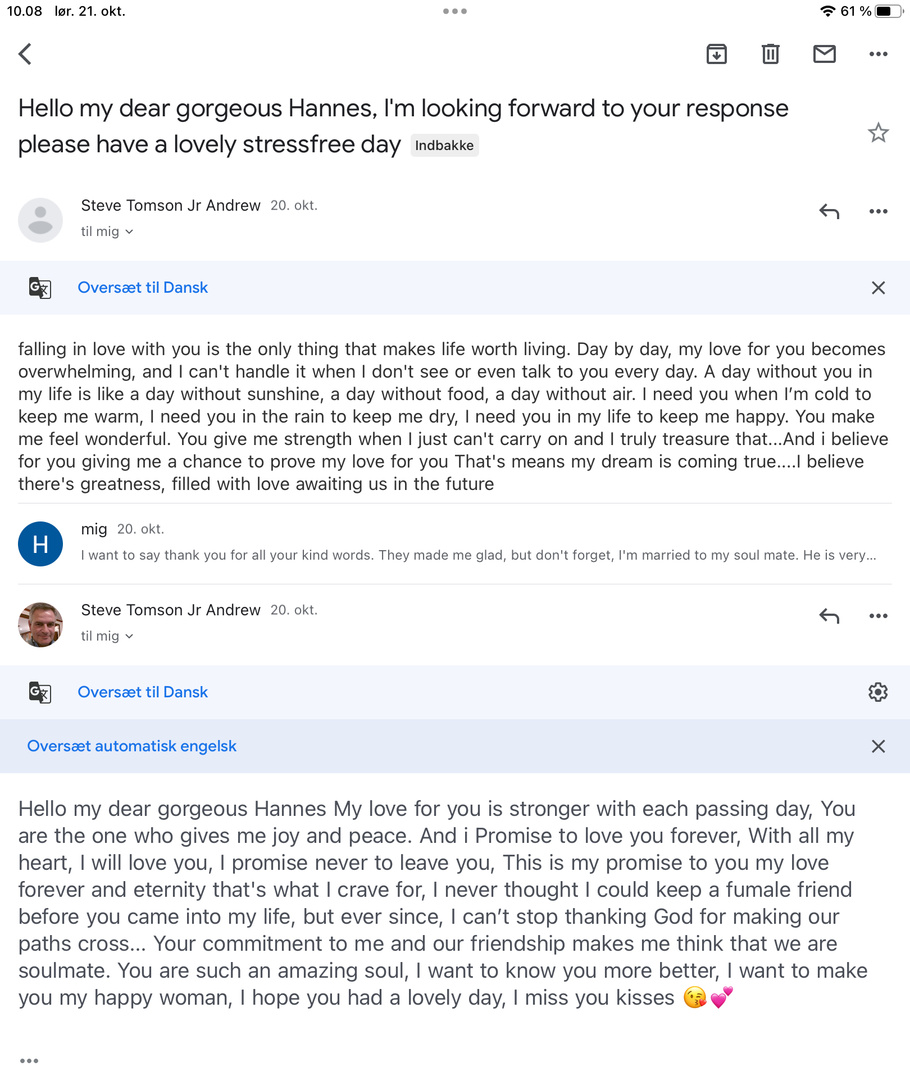 The screen shot from gmail shows that he wants us to be romantically engaged though he knows I’m married, but because my husband is terminally ill he may believe I’ll be an easy victim.